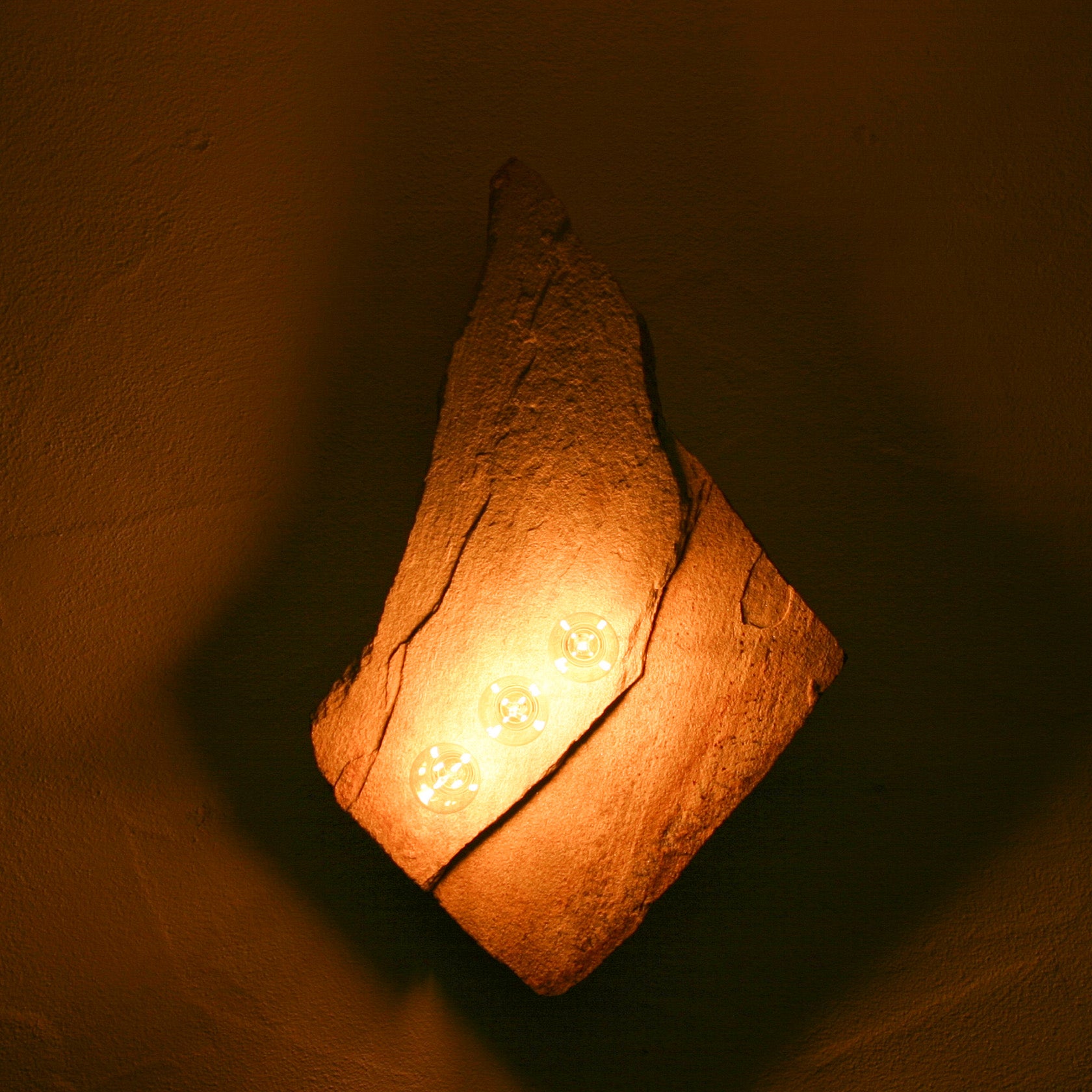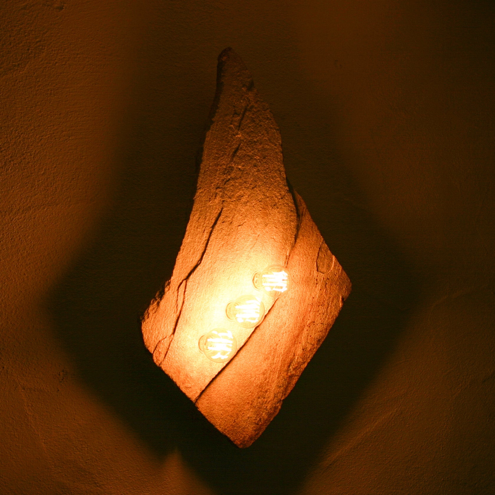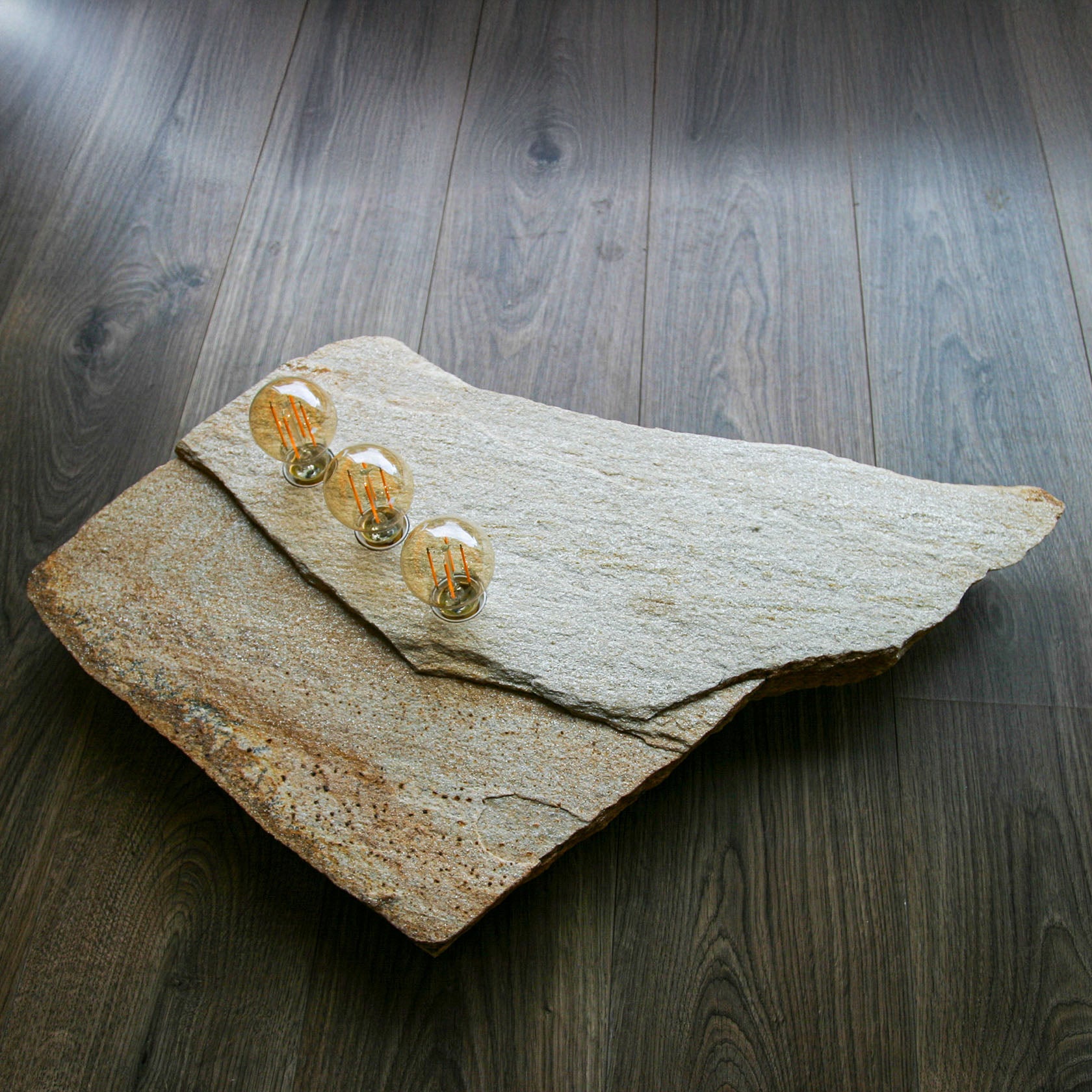 Eine der schönsten Goldgneisplatten, die wir je gefunden haben. Die an das legendäre Matterhorn erinnernde "Bergspitze" erwächst aus einer geradezu geometrisch, fast quadratisch konstruiert wirkenden Steinplatte. Diese ist durch einen Bruchversatz geteilt, dessen Linienführung für die drei in Reihe gesetzten Lampen natürlich aufgenommen wurde. Auch an diesem Fundstück ist nicht die kleinste Ecke bearbeitet, alle Ränder, Kanten und Flächen sind vollkommen natürlich. So einen Stein gibt es nicht noch einmal. Die im warmen Lichtschein fein glitzernde Goldgneis-Oberfläche vollendet die unglaubliche natürliche Ästhetik dieses Stückes, das als Solitär der Blickfang jedes Raumes sein kann. Wahrhaft eine würdige #001 und zugleich eines unserer besten "Prachtstücke".