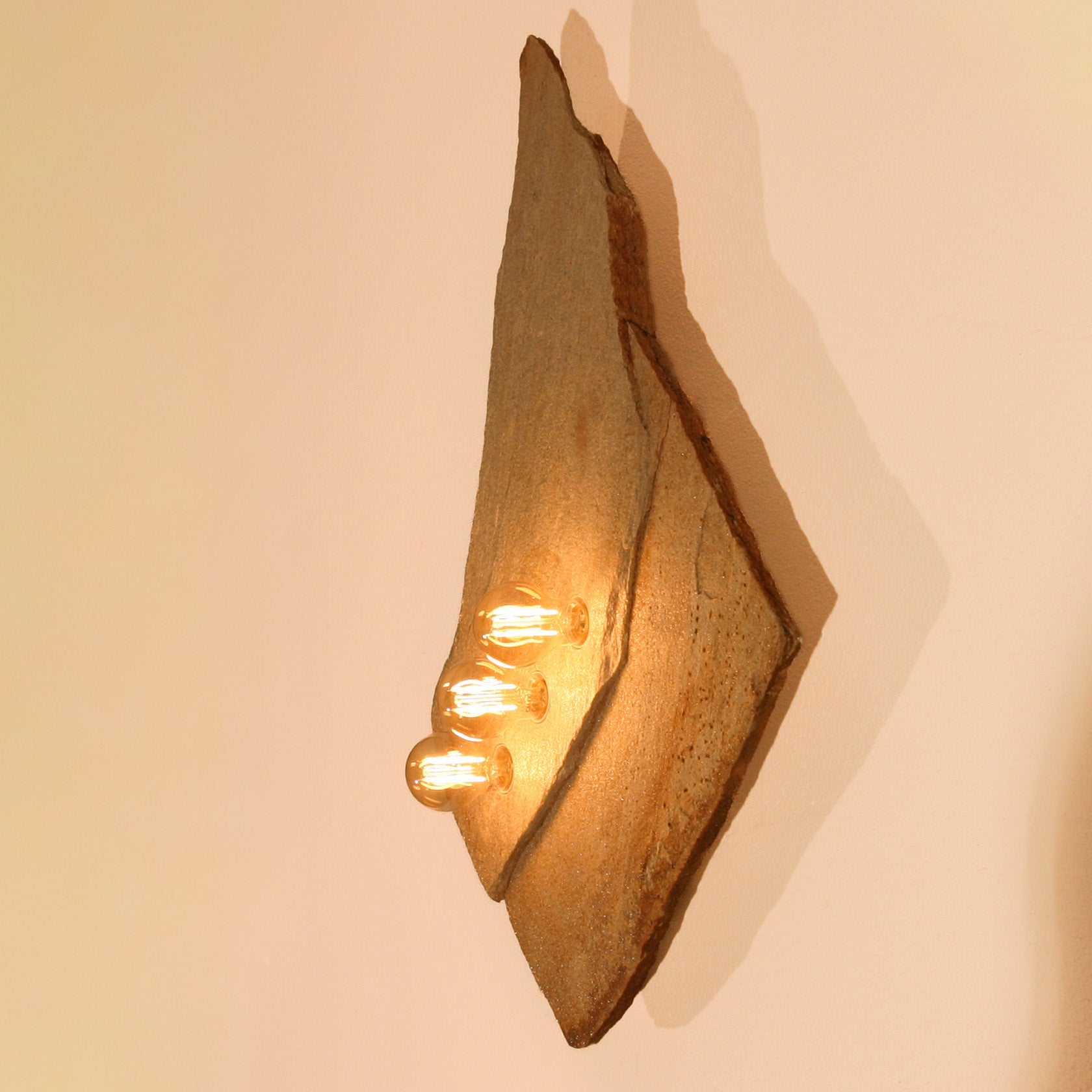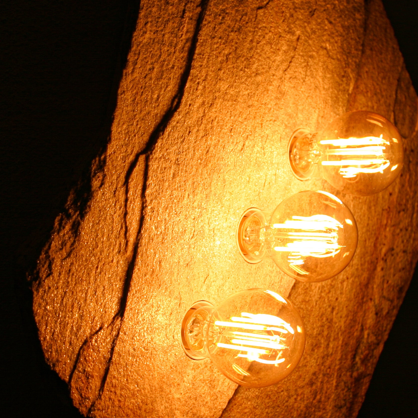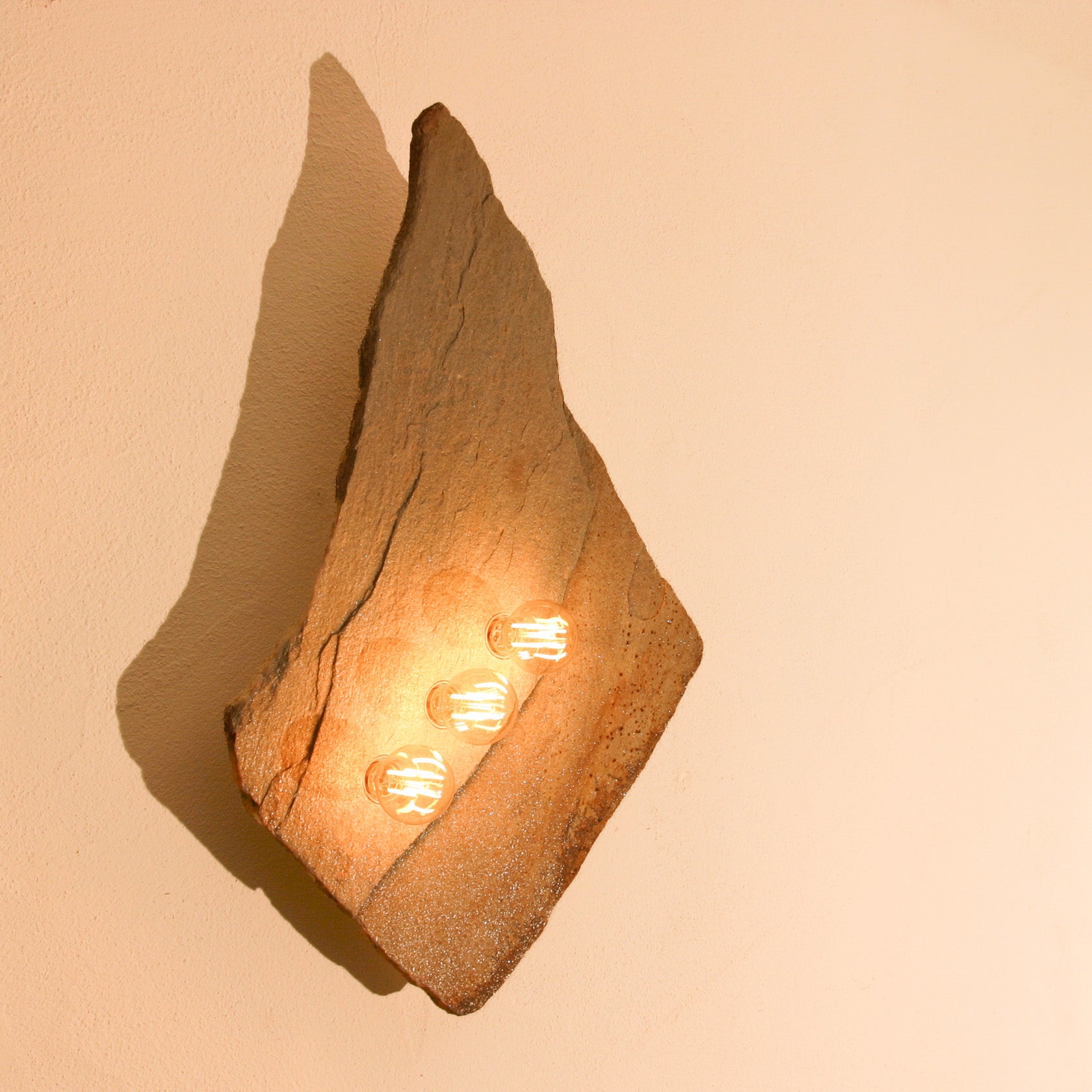 Eine der schönsten Goldgneisplatten, die wir je gefunden haben. Die an das legendäre Matterhorn erinnernde "Bergspitze" erwächst aus einer geradezu geometrisch, fast quadratisch konstruiert wirkenden Steinplatte. Diese ist durch einen Bruchversatz geteilt, dessen Linienführung für die drei in Reihe gesetzten Lampen natürlich aufgenommen wurde. Auch an diesem Fundstück ist nicht die kleinste Ecke bearbeitet, alle Ränder, Kanten und Flächen sind vollkommen natürlich. So einen Stein gibt es nicht noch einmal. Die im warmen Lichtschein fein glitzernde Goldgneis-Oberfläche vollendet die unglaubliche natürliche Ästhetik dieses Stückes, das als Solitär der Blickfang jedes Raumes sein kann. Wahrhaft eine würdige #001 und zugleich eines unserer besten "Prachtstücke".